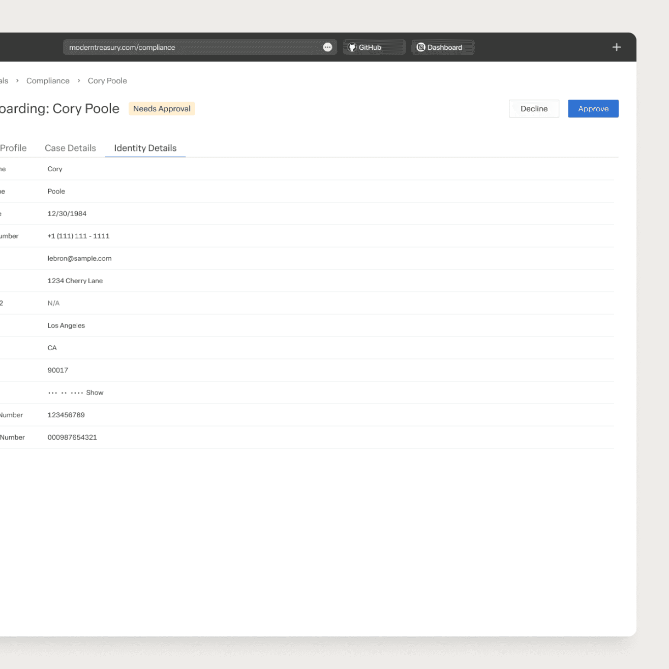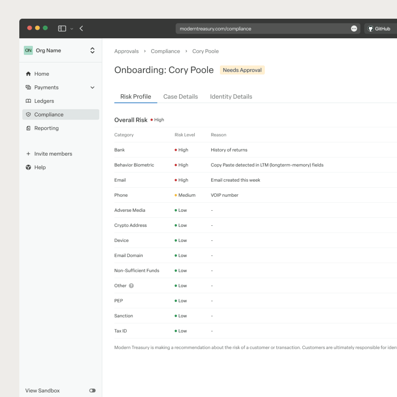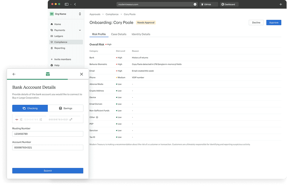 Customers could move money with Modern Treasury, but compliance lived outside the platform. Onboarding, case review, and risk monitoring relied on fragmented third-party tools that didn’t scale with enterprise needs.